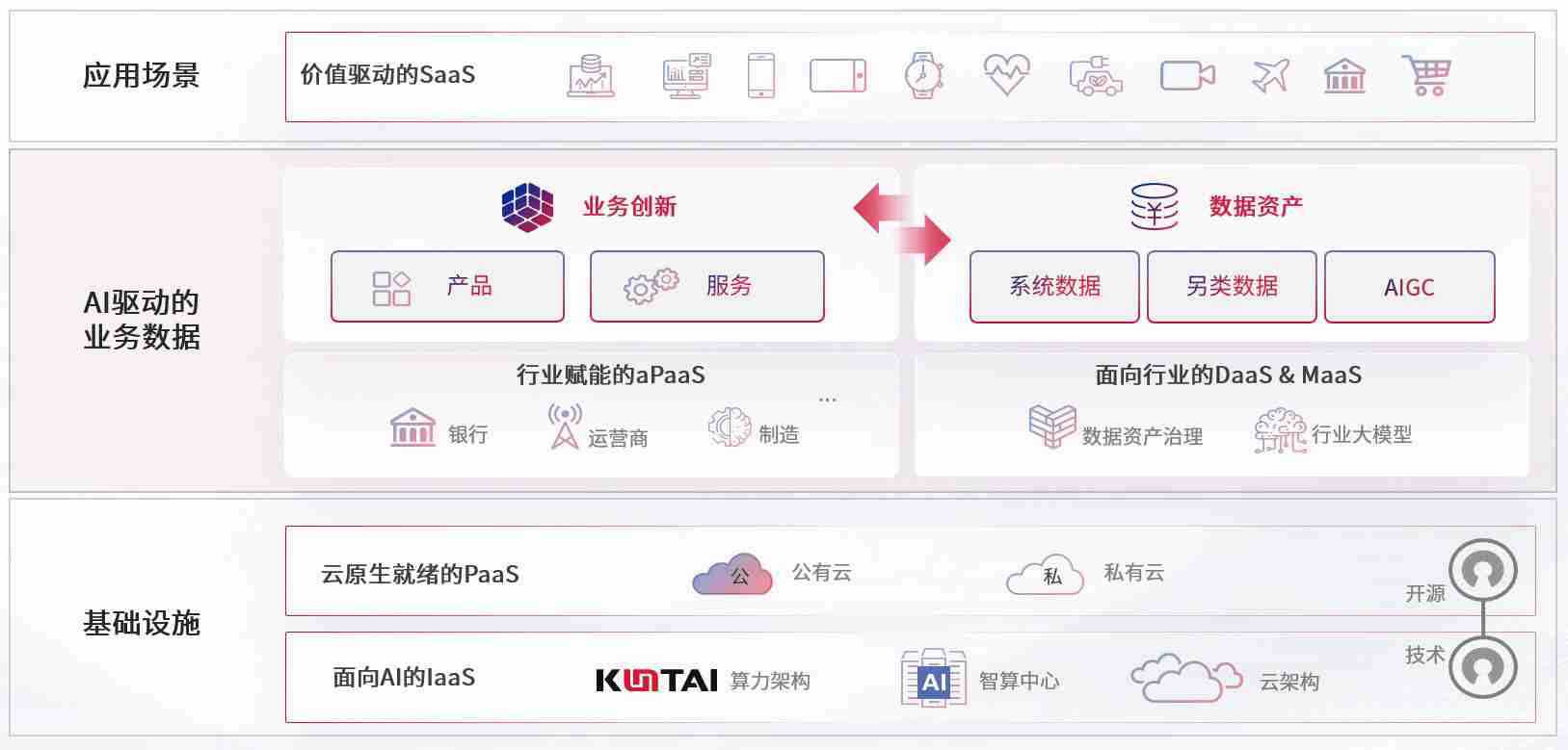 数字时代,,,,围绕企业数字化转型的关键要素,,,,新宝gg数码开创性的提出数云融合战略和技术体系框架,,,,着力在云原生、、、、数字原生、、AI原生和信创产业上架构产品和服务能力,,,为处在不同数字化转型阶段的快消零售、、、、汽车、、金融、、、、医疗、、、、政企、、教育、、运营商等行业客户提供泛在的敏捷IT能力和融合的数据驱动能力,,构建跨界融合创新的数字业务场景和新业务模式,,,,助力企业级客户建立面向未来的核心能力和竞争优势,,,,全面推动社会的数字化、、、智能化转型升级。。。。