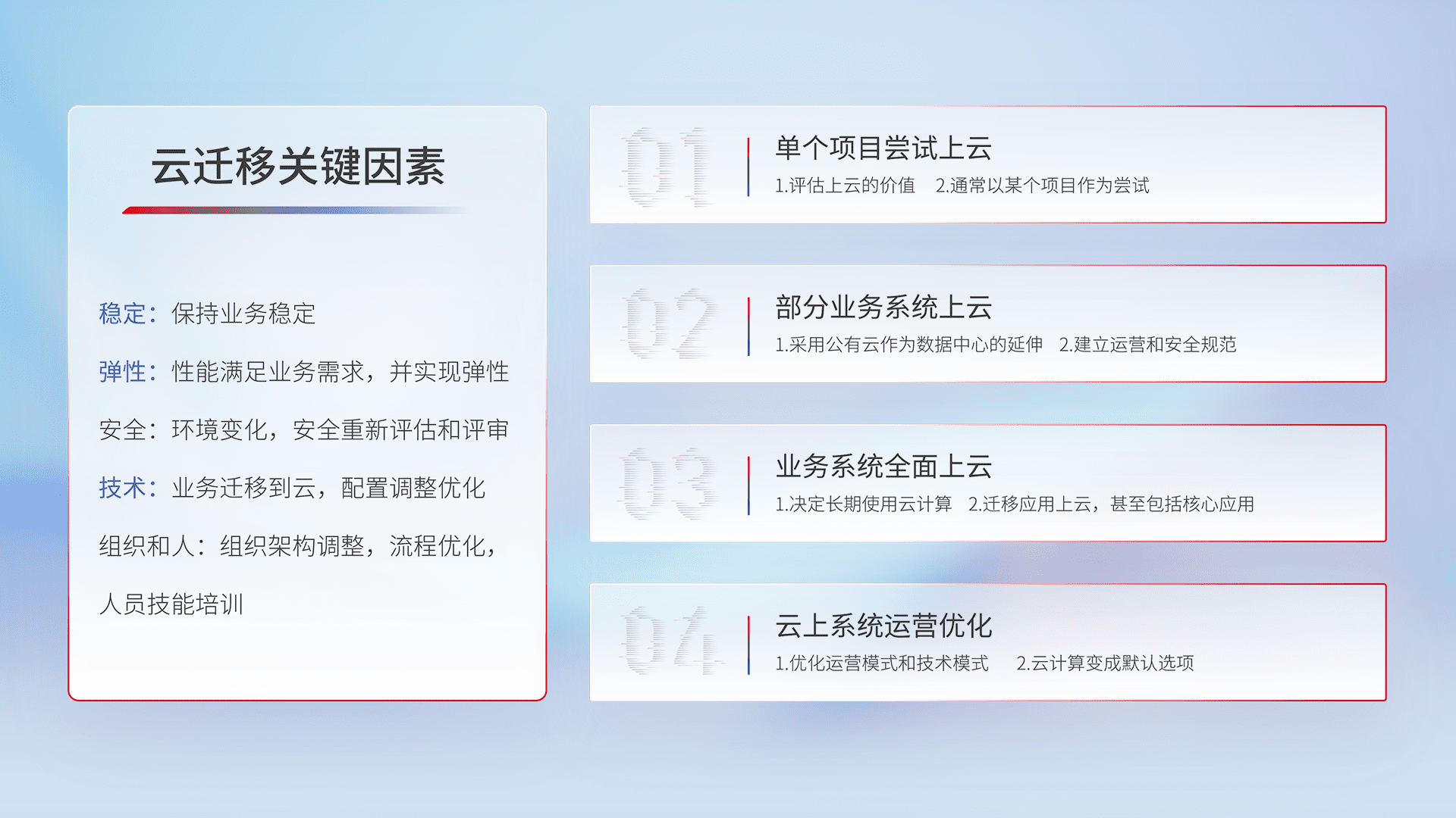 结合实际业务,,从规划设计、、云平台选型、、、、云原生改造、、、、数据迁移、、集成交付,,,,迁移全过程为客户识别最佳上云路径,,,做好风险识别管理,,,,设计网络架构、、身份权限、、、、安全审计合规、、、、操作审计、、日志审计、、监控告警策略、、、、多站点容灾设计等,,,对云上基础设施进行整体规划,,,,提升IT治理水平,,,以满足弹性、、、高可用、、、高性能的需求。。。。