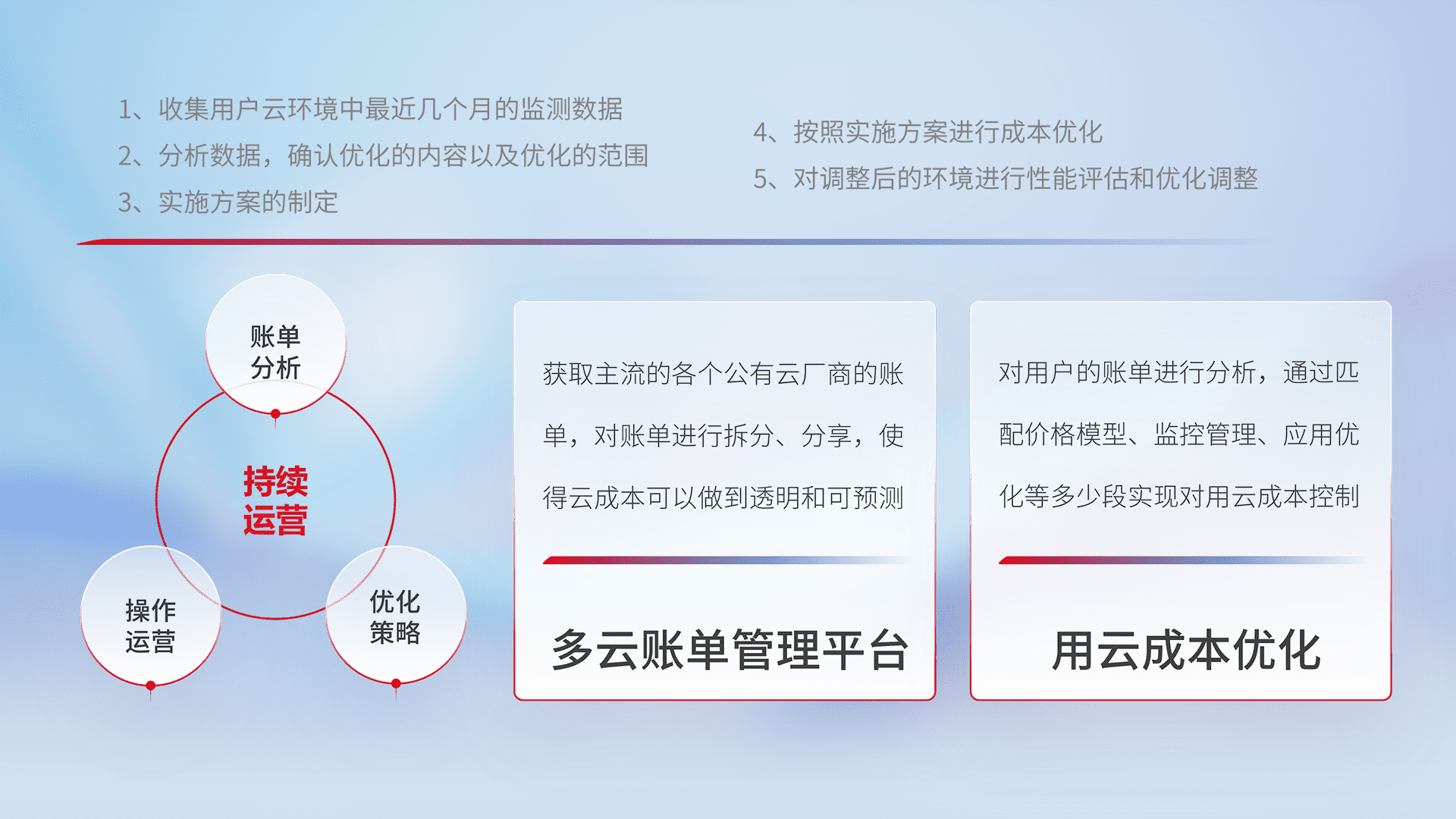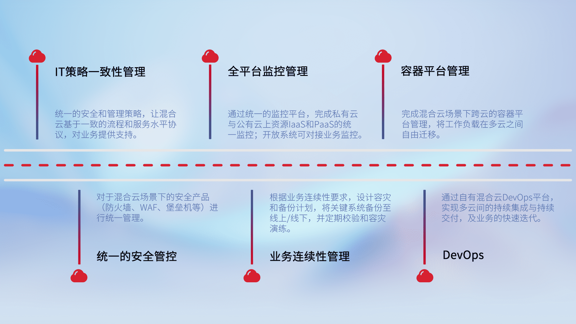 通过多云纳管,,,以统一的资源数据模型把客户的云资源进行抽象和封装,,,进而实现对多云资源的统一操作,,,,保障云资源管理的可靠性、、、稳定性与可用性。。。。量身定制化运维内容,,,配置、、、、开发运维、、、补丁管理、、、备份、、、、监控、、、认证和访问管理、、、审计和日常巡检等,,,,保障在用云过程中的可靠度,,稳定度以及高可用率。。。。